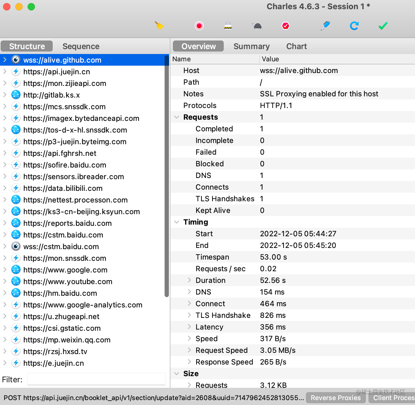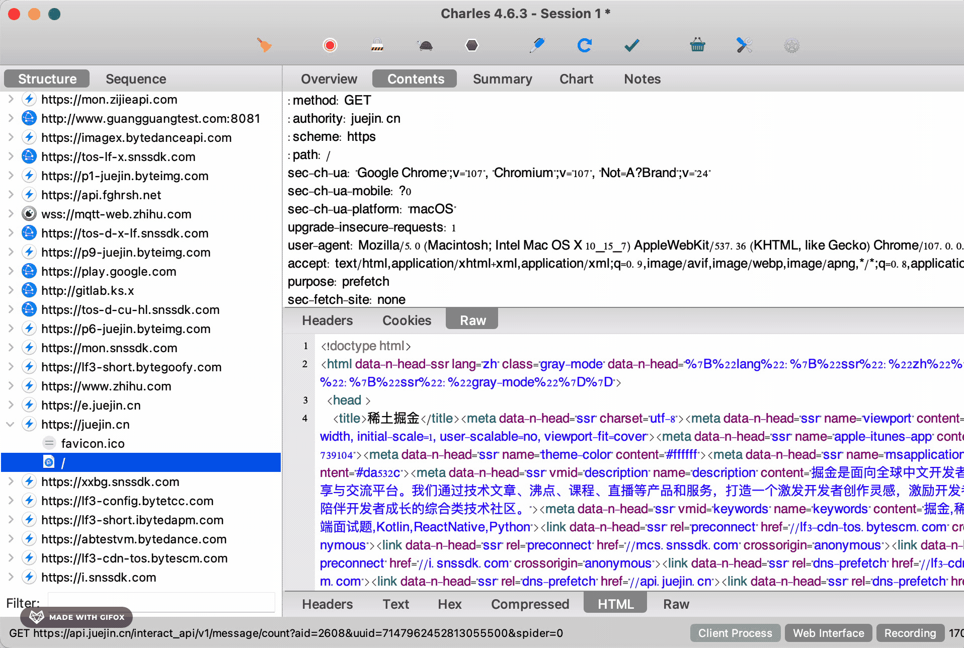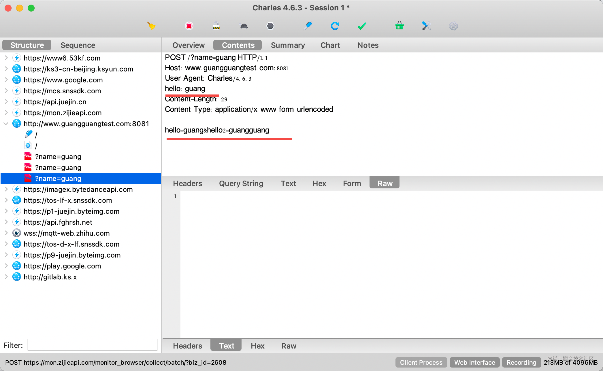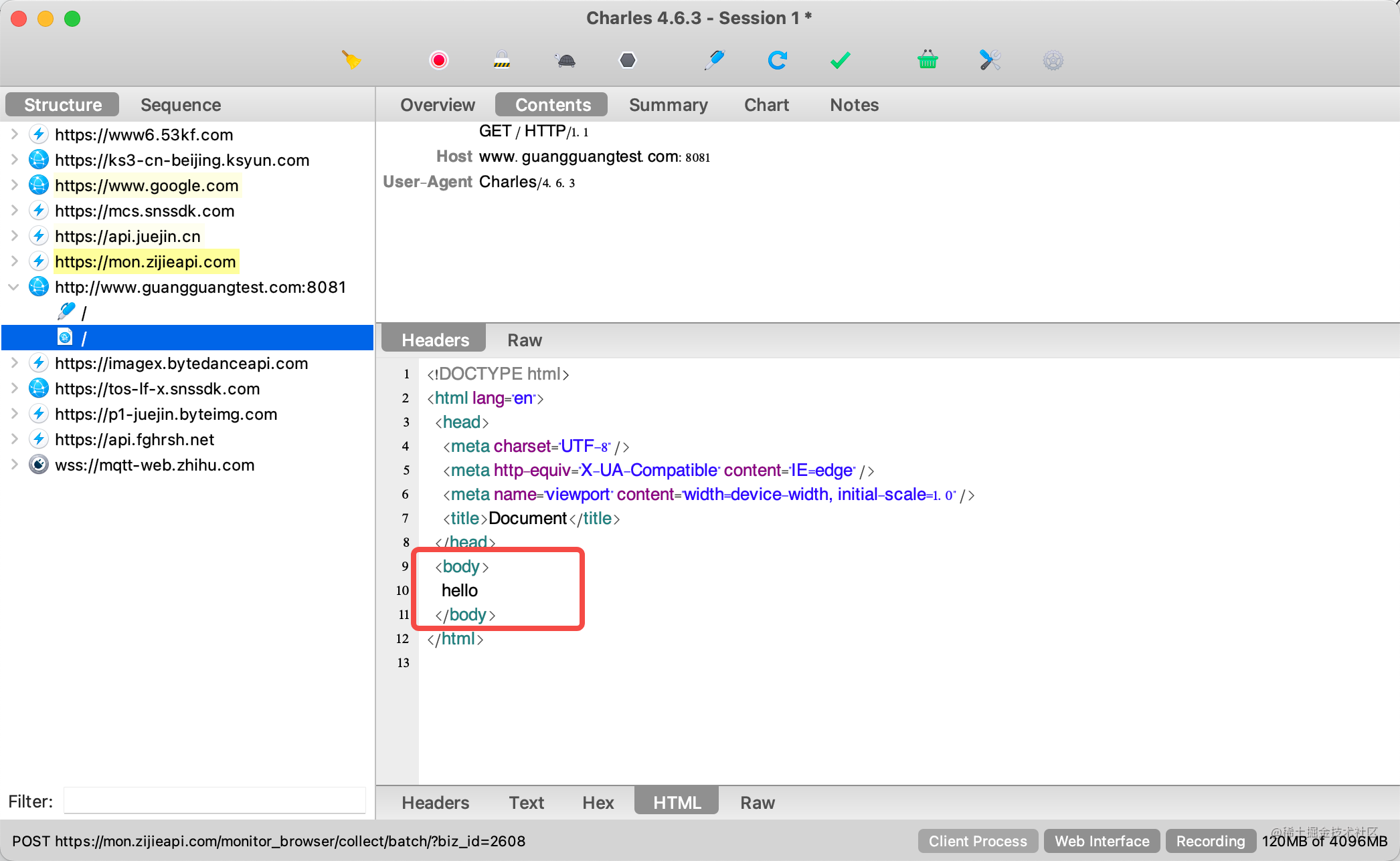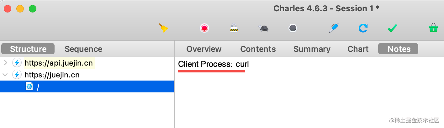 在终端设置为 charles 代理之后,之后的 http 请求也会被 charles 捕获到:
