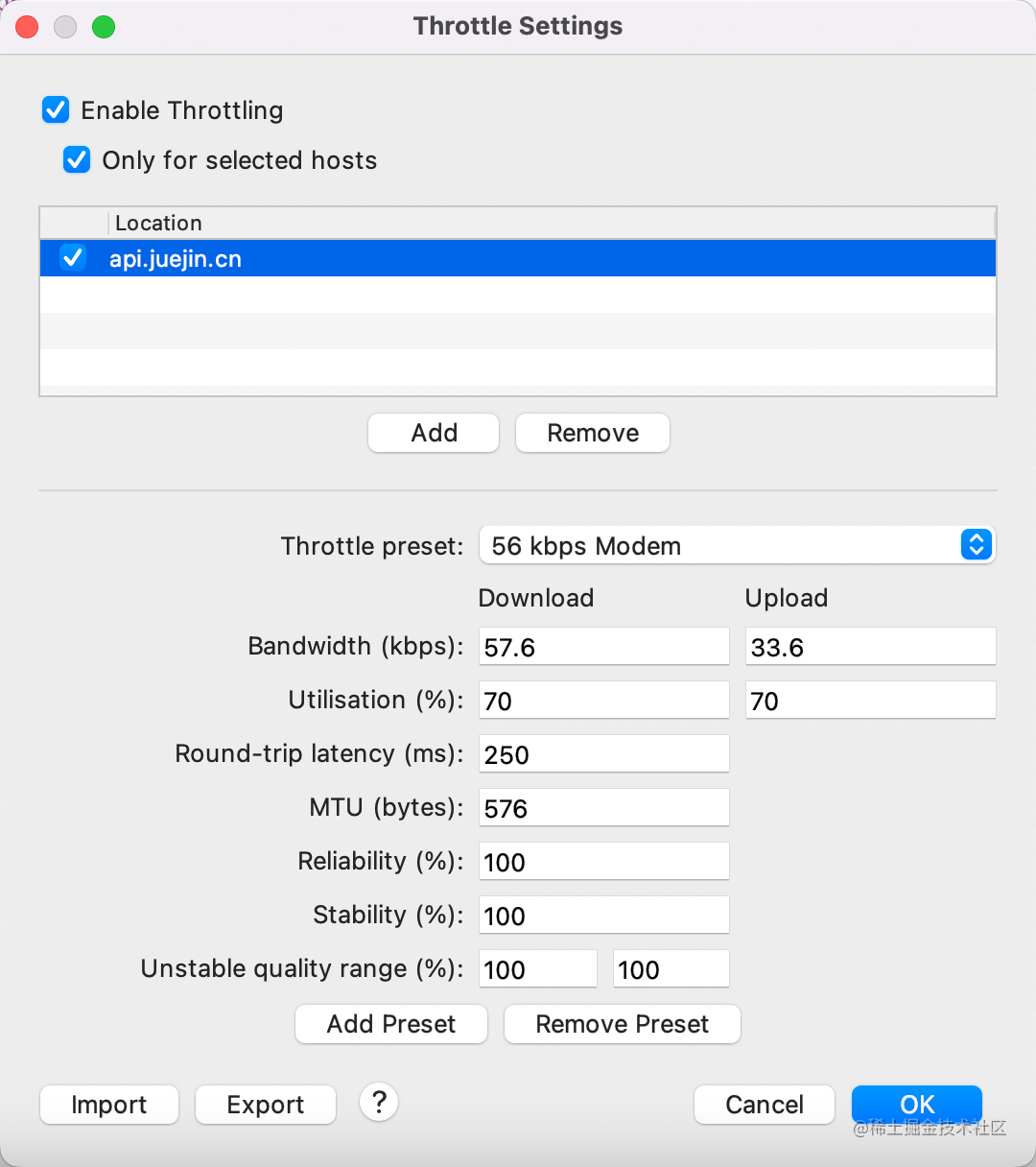 当然,一般我们只需要对某些域名开启 throttle,可以在 Proxy > Throttle Settings 里设置: