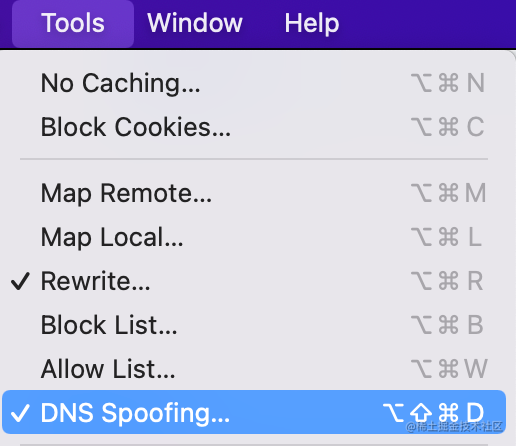 charles 也有这个功能,叫做 DNS Spoofing(DNS 欺骗),在 Tools > DNS Spoofing 开启: