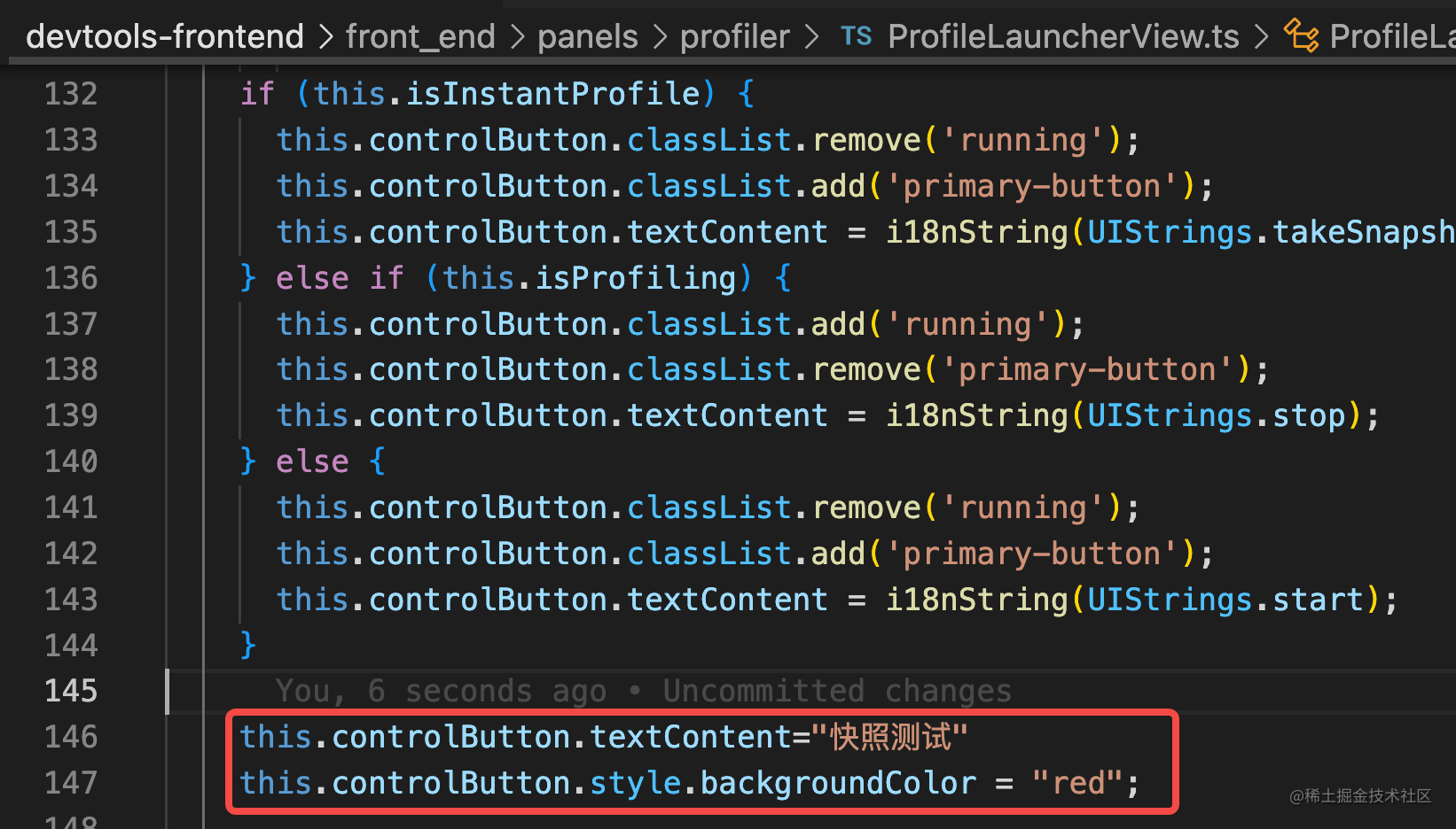我们改一些代码,比如 front_end/panels/profiler/ProfileLauncherView.ts 里加两行代码: