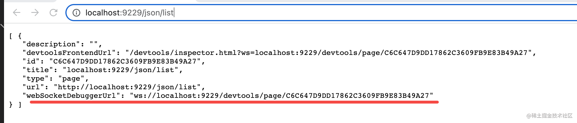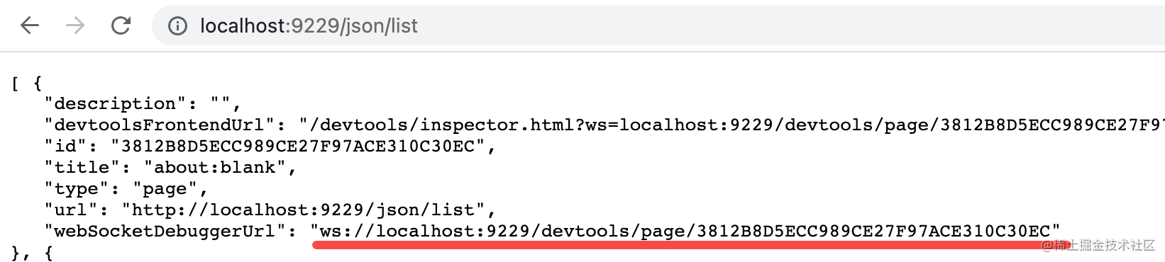 CDP 传入 port 参数和 tab 参数,那连接的就是这个 tab 页面的 ws 调试服务,也就是我们在 /json/list 里看到的那个: