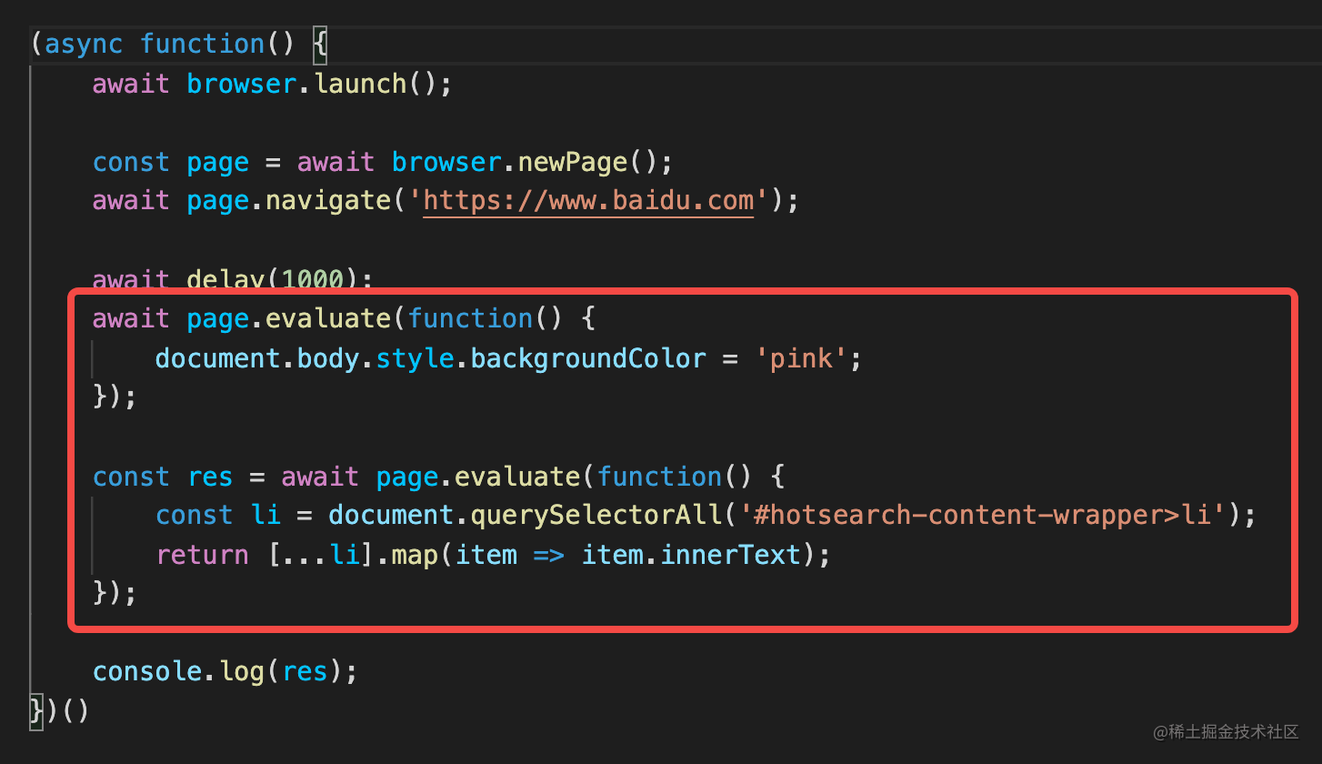 puppeteer 还能远程执行 JS,也就是在脚本里写一段 JS,puppeteer 会把它发给浏览器执行,最后返回结果。