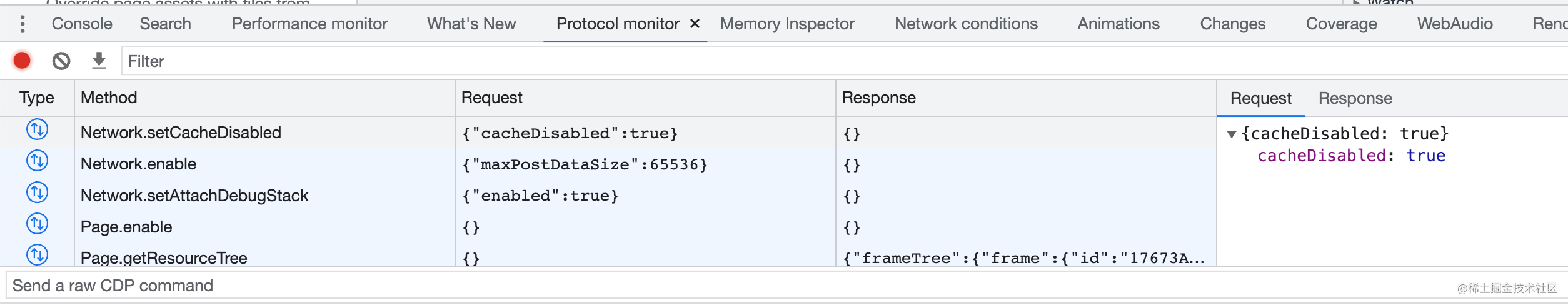 在 chrome devtools 里打开 Protocol Monitor,就可以看到 CDP 的数据: