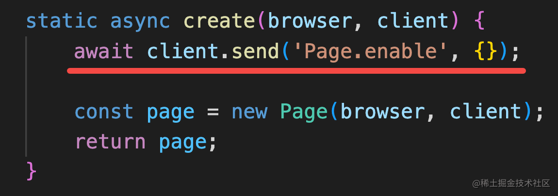 static async create(browser, client) { await client.send('Page.enable', {});