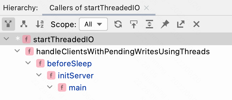 我们在第 28 讲《内核解析篇:Redis 事件驱动核心框架解析》中介绍 aeEventLoop 结构体的时候提到,每次处理网络事件之前,都会调用 aeEventLoop->beforesleep 指向的函数,也就是 beforeSleep() 函数。如下图调用链所示,beforeSleep() 底层调用的 startThreadedIO() 函数就是释放 IO 线程锁,让 IO 线程跑起来的地方,同时,它里面还会将 io_threads_active 字段设置成 1,表示当前 I/O 线程已经可用。
