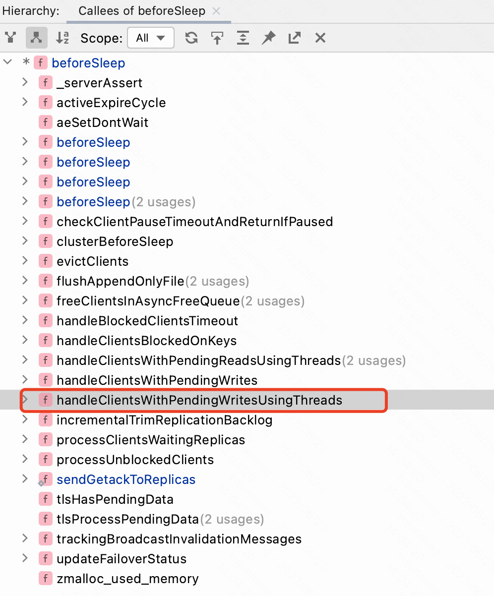 弄明白 client->buf 缓冲区的填充逻辑以及主线程与 IO 线程的交互逻辑之后,我们继续主线程的执行逻辑。当主线程执行到 beforeSleep 函数时,里面会调用 handleClientsWithPendingWritesUsingThreads() 函数,将 server.clients_pending_write 队列中的 client,分配需要写回的 client 给 IO 线程进行处理。