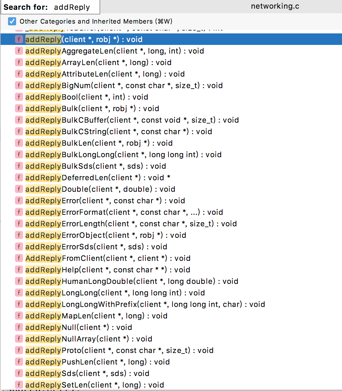 从名字就可以看出,addReplyBulk() 函数是向某个地方添加返回值,返回值的格式还是 Bulk String 的格式。按照这个思路,我们可以在 networking.c 文件中看到很多 addReply*() 函数,也都是写入返回值的入口。