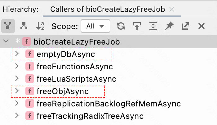 bioCreateLazyFreeJob() 第一个参数是个函数指针,指向了用于回收函数,熟悉 Java 的小伙伴可以把它理解成 Runnable 中 run() 方法的实现,这里回收单个 Value 值使用的是 lazyfreeFreeObject() 函数,这个函数里面会调用 decrRefCount() 函数减少待释放 robj 实例的引用次数,也就是 refcount 字段值,当其降为 0 时,就会根据对应的类型和编码方式调用对应的 *Release() 函数。