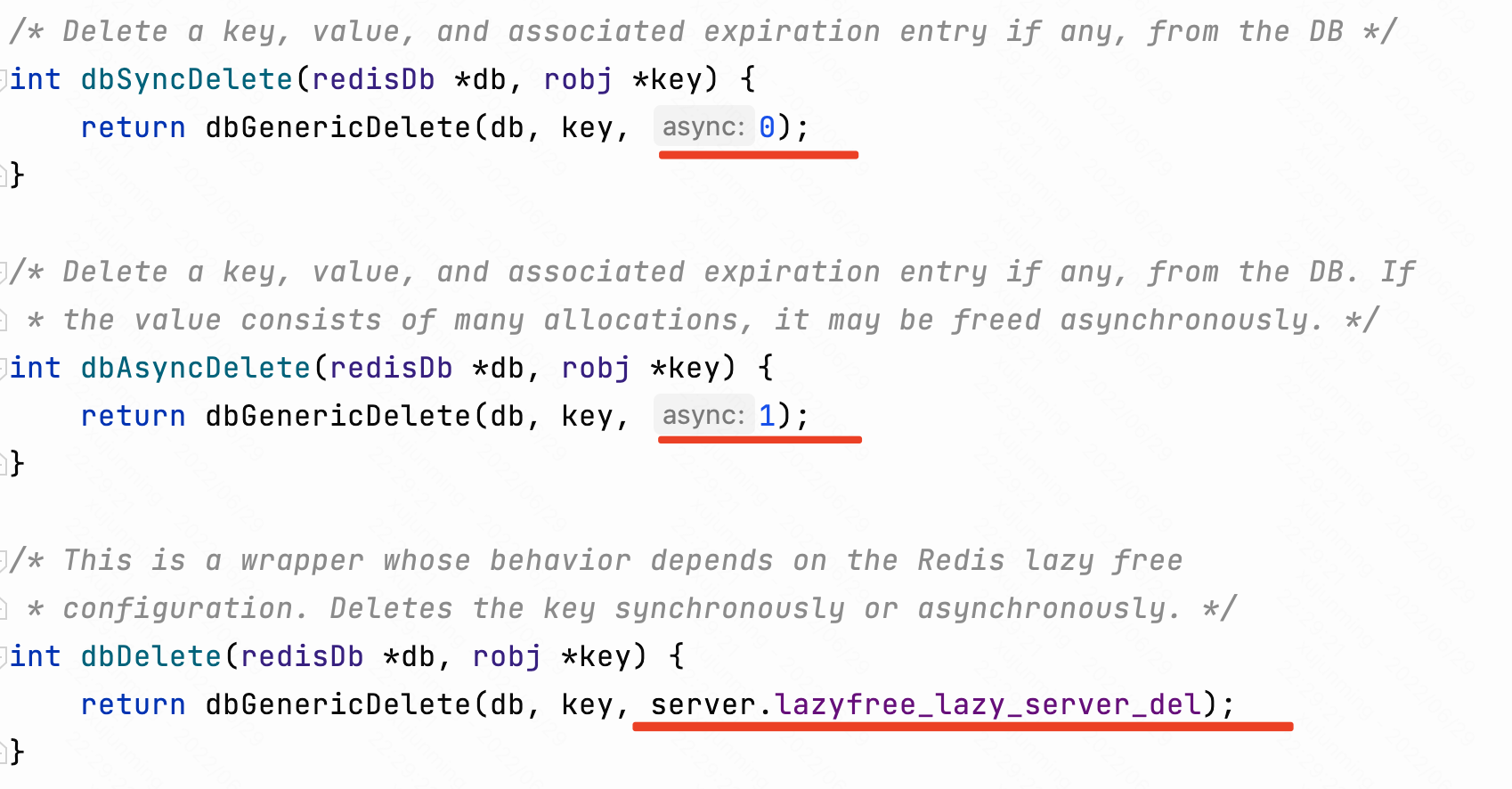 一旦决定对一个槽位进行扫描,就会将其中的全部 Key 都扫描完,遇到过期的 Key 就会调用 activeExpireCycleTryExpire() 函数释放键值对的内存空间,其中会根据 lazyfree-lazy-expire 配置值决定同步释放还是异步释放。(同步和异步释放内存的逻辑前面已经详细分析过了,这里不再重复。)