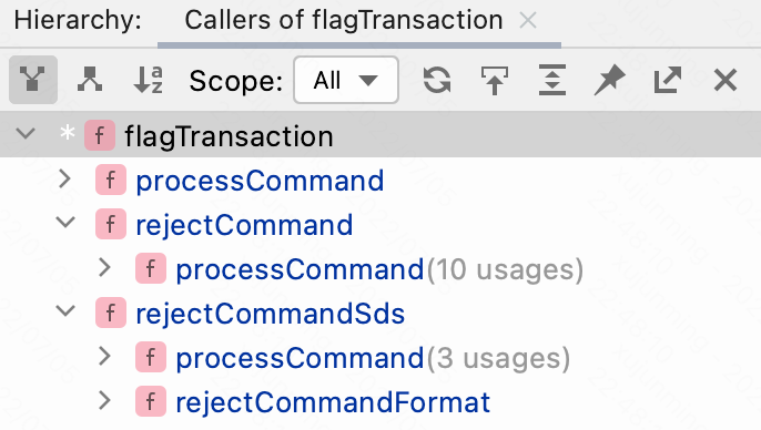 这里我们看到,client->flags 字段中还可以设置一个 CLIENT_DIRTY_EXEC 标记,该标记表示的是客户端在一个事务中入队命令的时候出现了异常,此时客户端再发起 EXEC 命令时,也是无法提交事务的,而是直接通过 discardTransaction() 函数释放事务。设置 CLIENT_DIRTY_EXEC 标记的地方位于 flagTransaction() 函数,从下图的调用栈可以看出,flagTransaction() 函数的调用集中在 processCommand() 中
