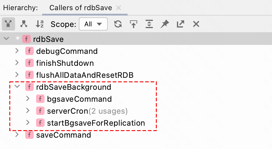 分析完写入 RDB 文件的格式以及 RDB 持久化的核心实现之后,我们回到触发 RDB 持久化的地方会发现,除了 SAVE 命令之外,其他 rdbSave() 函数调用都是来自 rdbSaveBackground() 函数,如下图调用栈所示: