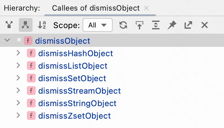 dismissObject() 函数底层会针对不同的类型进行分类处理,如下图调用栈所示: