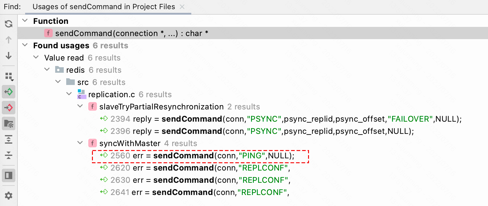 建连之后,从库处于 REPL_STATE_CONNECTING 状态,此时会注册对连接可读事件的监听(回调依旧是 syncWithMaster() 函数)并向主库发送 PING 命令。向主库发送命令的逻辑封装在 sendCommand() 函数中,后续发送其他命令也是由 sendCommand() 函数完成的,调用栈如下所示: