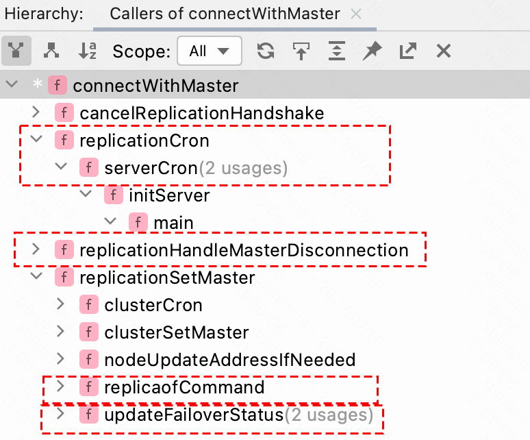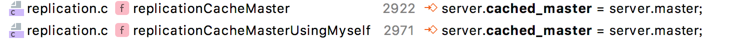 其中,replicationCacheMaster() 是在 freeClient() 中被调用的,也就是主从连接断开时被调用;replicationCacheMasterUsingMyself() 是在主库转换为从库时被触发。这两个函数的实现我们后面碰到了,再展开细说,这里只需要知道 master 和 cached_master 之间的关系即可。