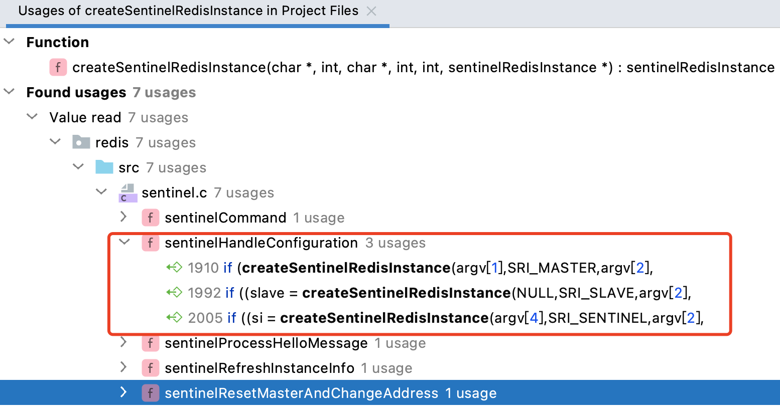 前文提到 Sentinel 解析配置文件的核心逻辑位于 sentinelHandleConfiguration() 函数中,解析上述三个 sentinel 配置项的时候,它都会调用 createSentinelRedisInstance() 函数创建对应 sentinelRedisInstance 实例,如下图所示: