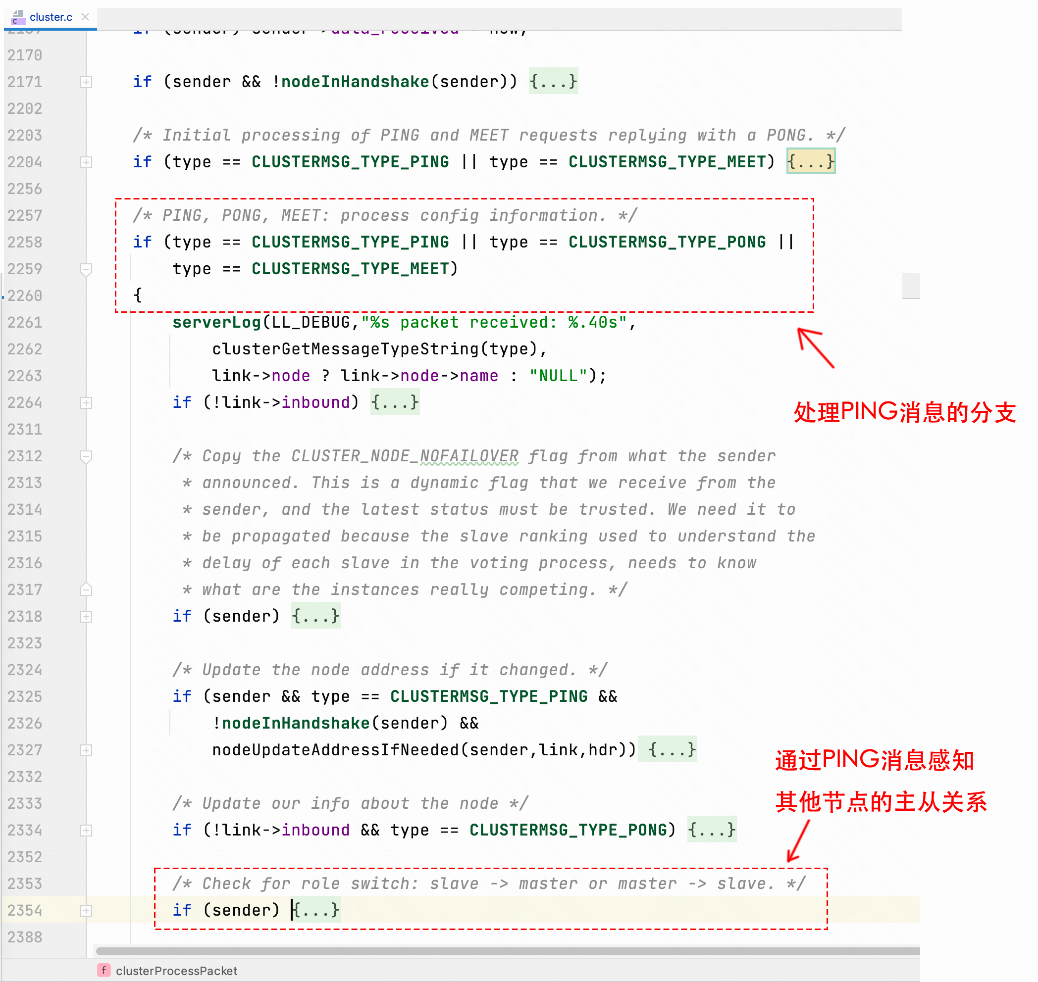 这部分处理逻辑位于 clusterProcessPacket() 函数中,具体位置如下图所示,感兴趣的同学可以参考源码进行学习。
