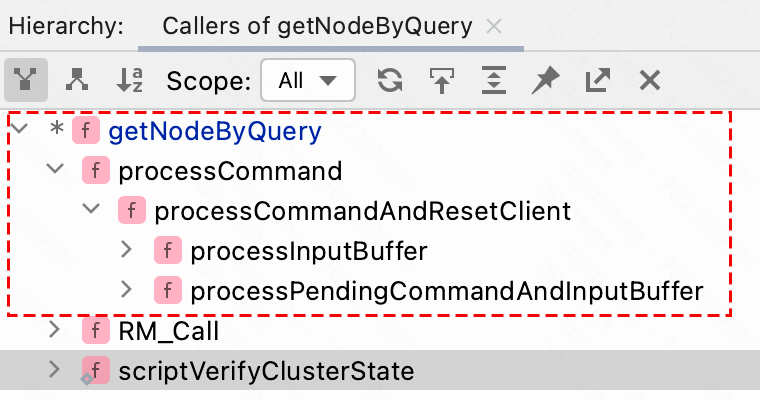 之所以执行设置这两个状态,是为了处理后续 slot 迁移过程中收到的客户端请求。如果我们迁移过程中,一个客户端来请求 slot 100 中的 Key1,当 GET Key1 命令发给节点 A 时,如下图调用栈所示,节点 A 在命令执行之前,会调用 getNodeByQuery() 节点检查 slot 100 的状态: