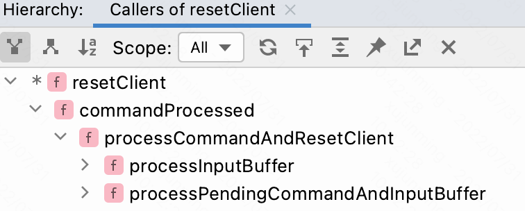 通过下图展示的调用栈可以看出,resetClient() 函数是在命令执行完成之后被立即调用的: